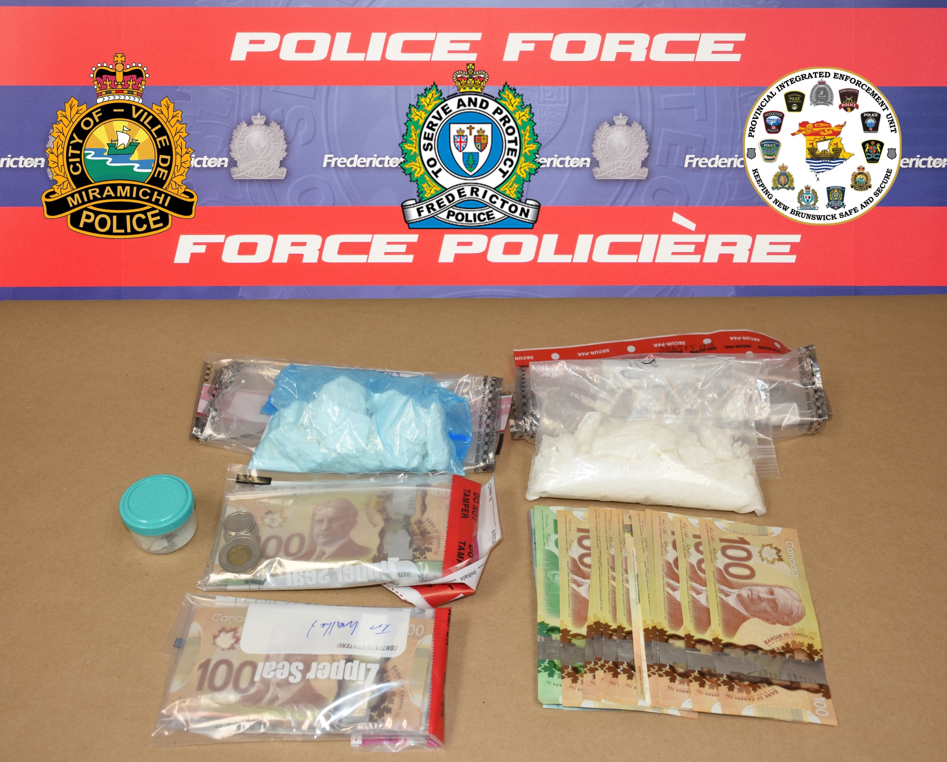 Le 19 septembre 2025, une opération ciblée a mené à l'arrestation d'un homme de 41 ans de Grey Rapids, au Nouveau-Brunswick, et d'une femme de 48 ans de Miramichi, au Nouveau-Brunswick. Les agents ont saisi près de 110 grammes de cocaïne, plus de 150 grammes de méthamphétamine et plus de 1 300 $ en espèces.